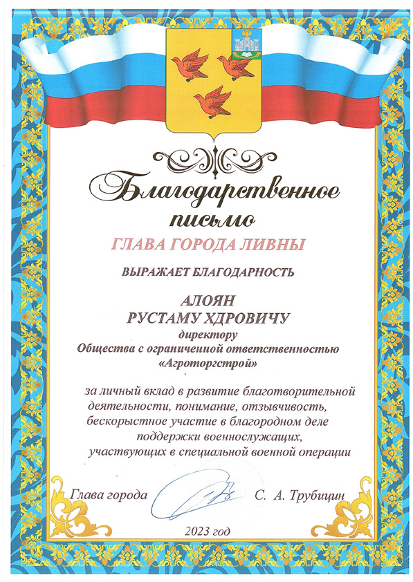 Благодарность главы города Ливны 2023 г